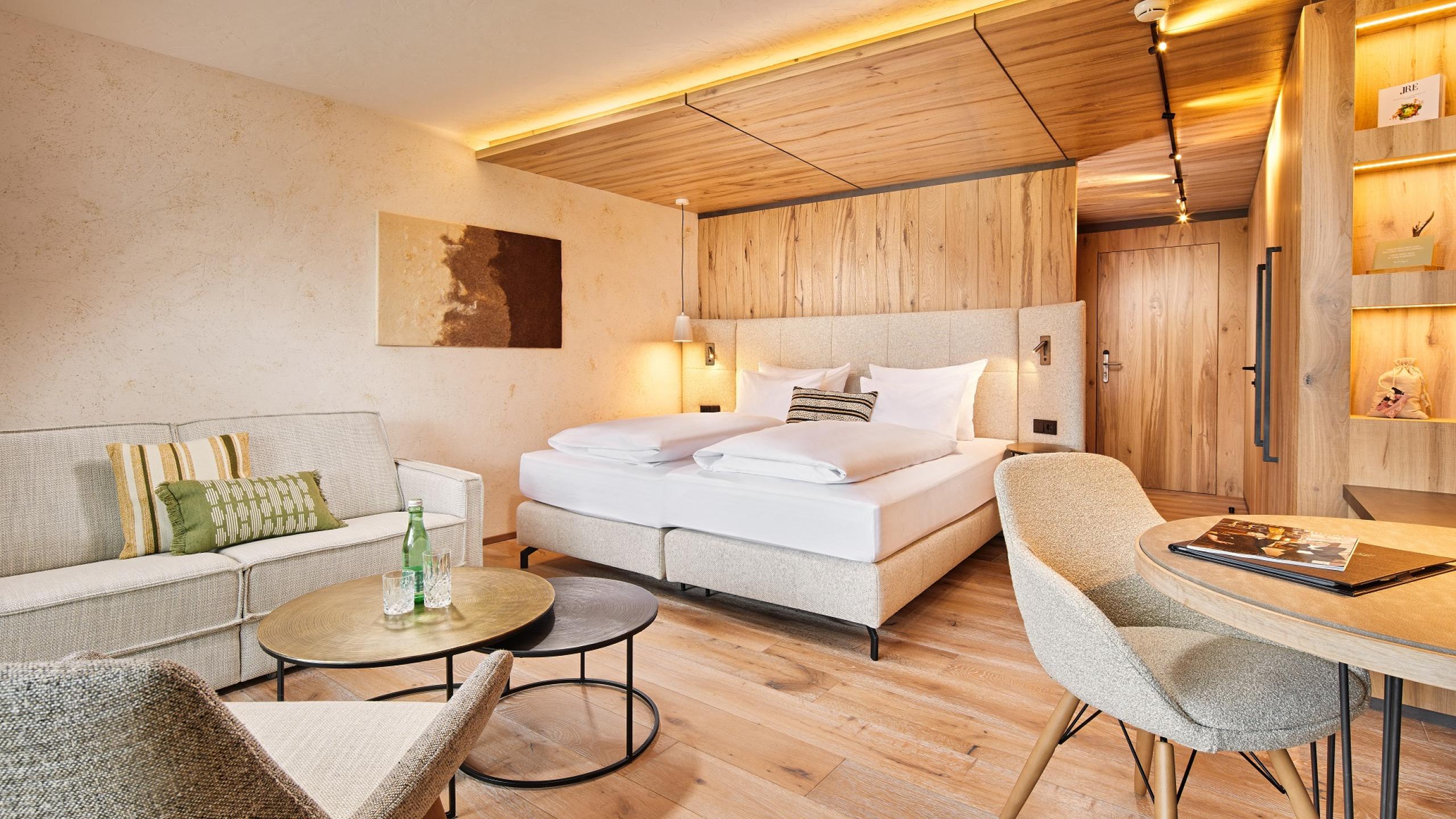 All our rooms are equipped according to standard with telephone, safe, hairdryer, satellite TV, free Wi-Fi, and a rented wellness basket with snuggly bathrobes, sauna towels, and slippers. An umbrella and a rucksack are also provided in each room. You are welcome to use them throughout your stay – at no charge, of course. Please note that the room pictures and floor plans may differ slightly from the original. The prices are per person and night including our gourmet board with breakfast buffet, afternoon snack, and 5-course menu in the evening. The visitor’s tax of € 2.50 per adult and day is not included. Dogs are allowed in some room categories at the Sonnenhof. The surcharge for a dog is € 30.00 per night without food. If necessary we charge at least €60.00 for a more elaborate final cleaning.