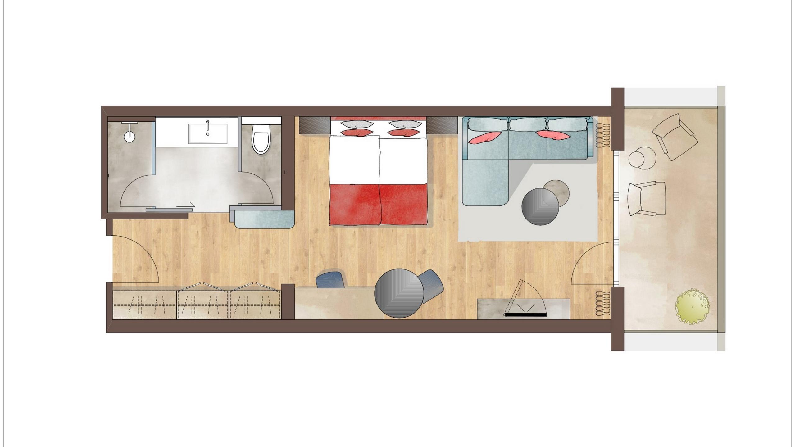 Do you love spending time in summer and winter enjoying the midday sun from your balcony? Then this suite on the 1st or 2nd floor is the right place for you. From the balcony facing south-west you have a wonderful view of the Litnis mountain and of the alpine meadows in summer. In addition, the suite is furnished with a large double bed, a corner sofa, a desk, and a bathroom with ground-level shower and WC.