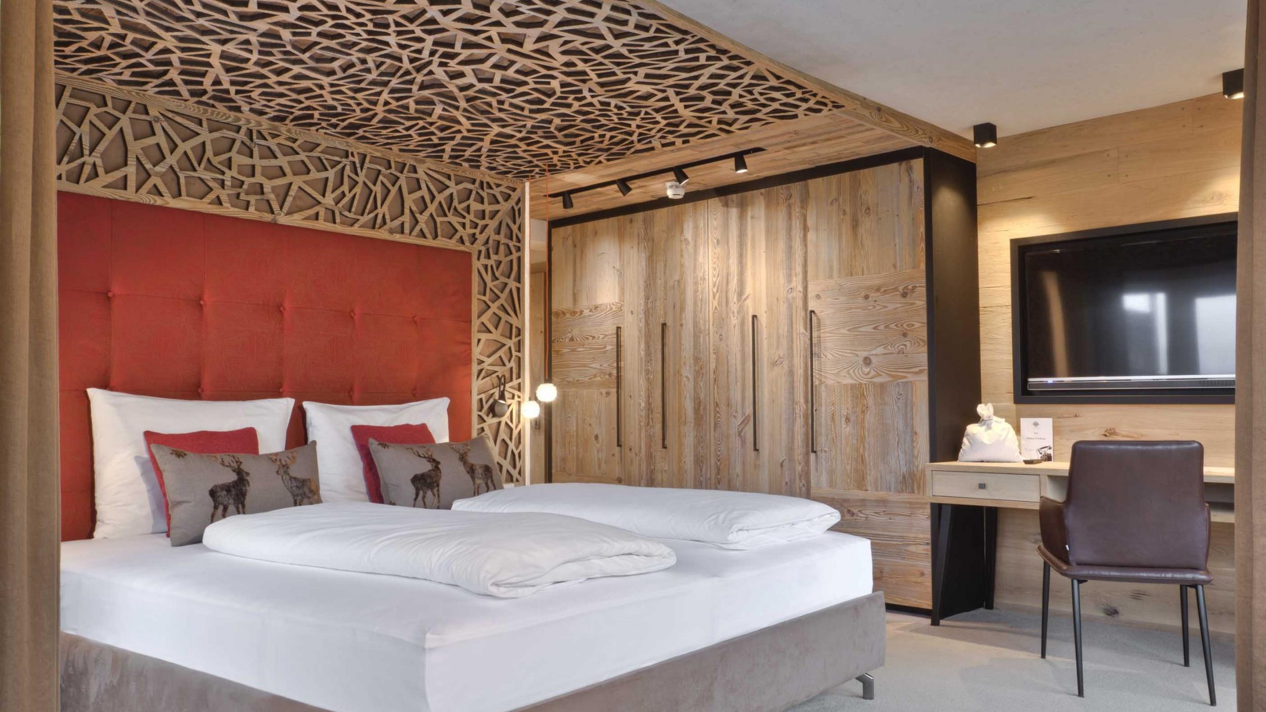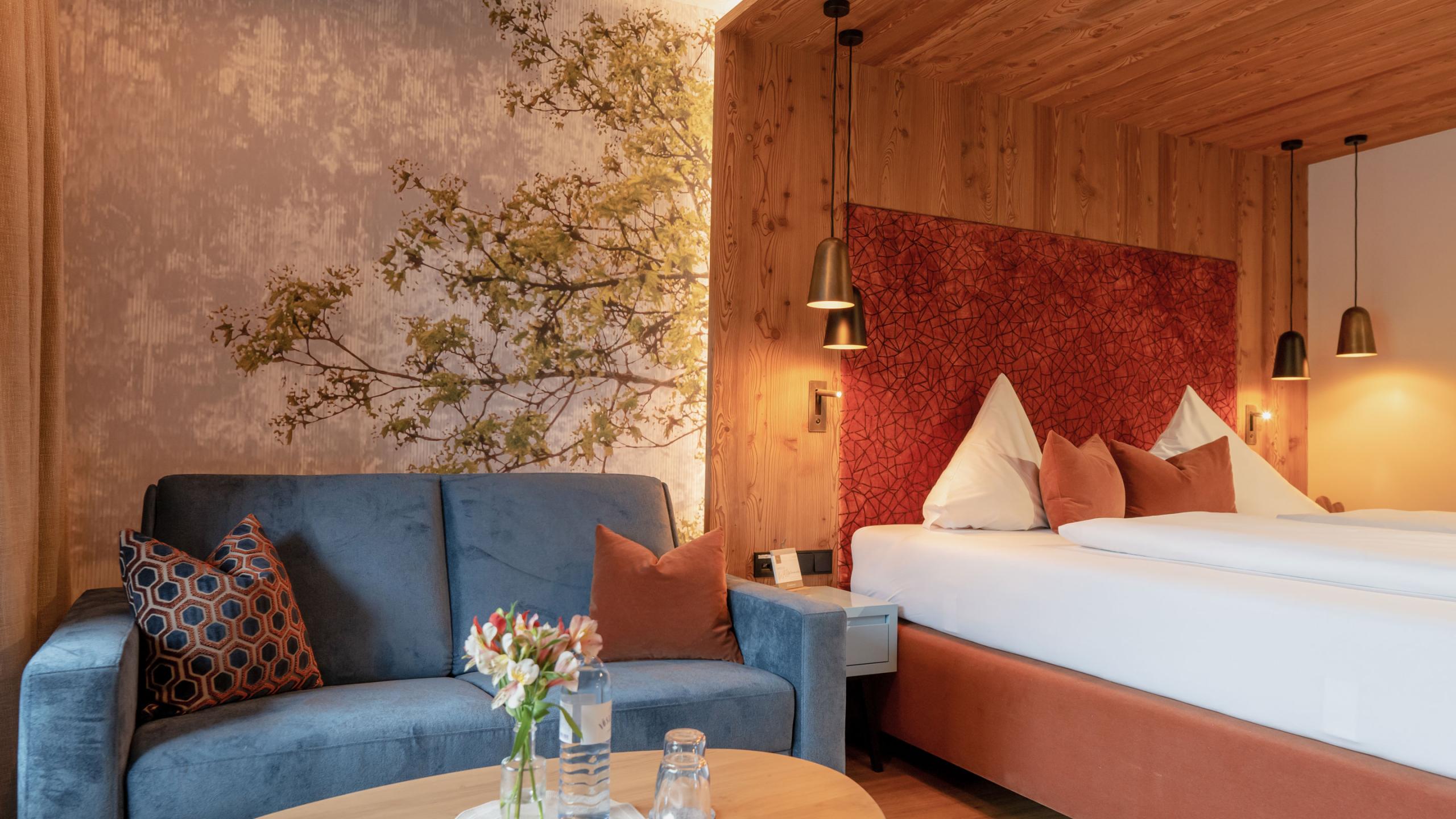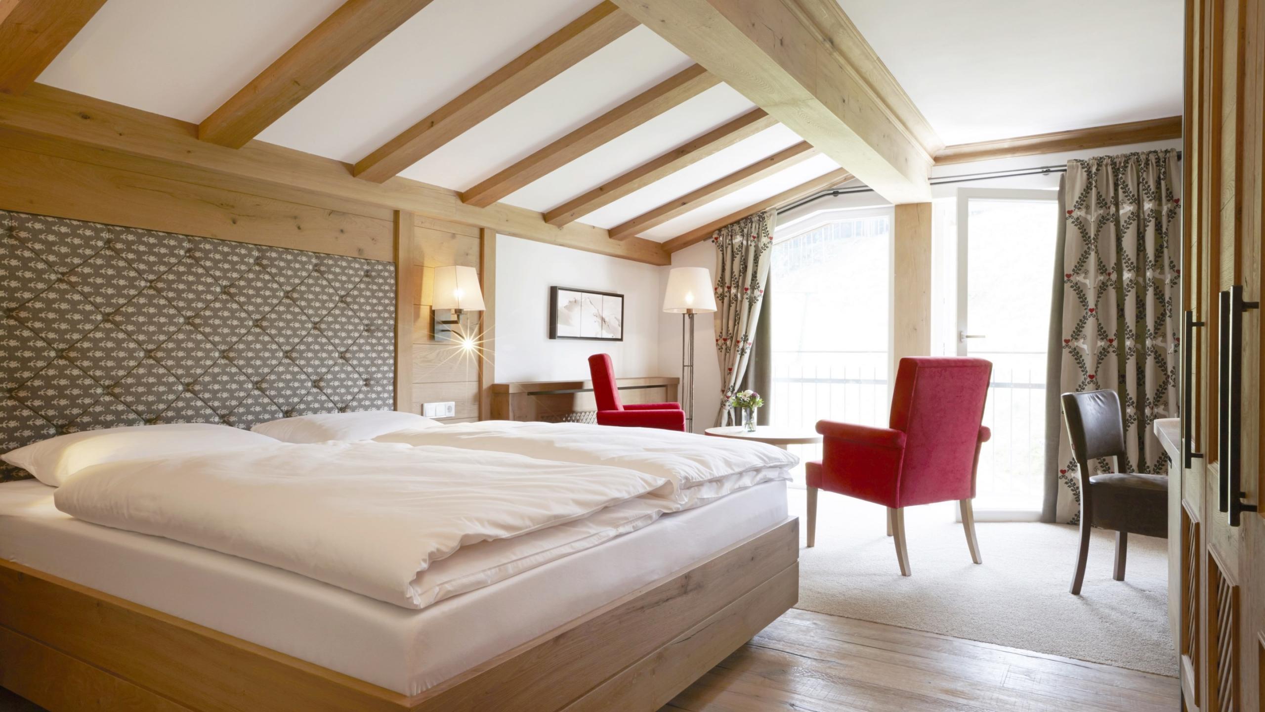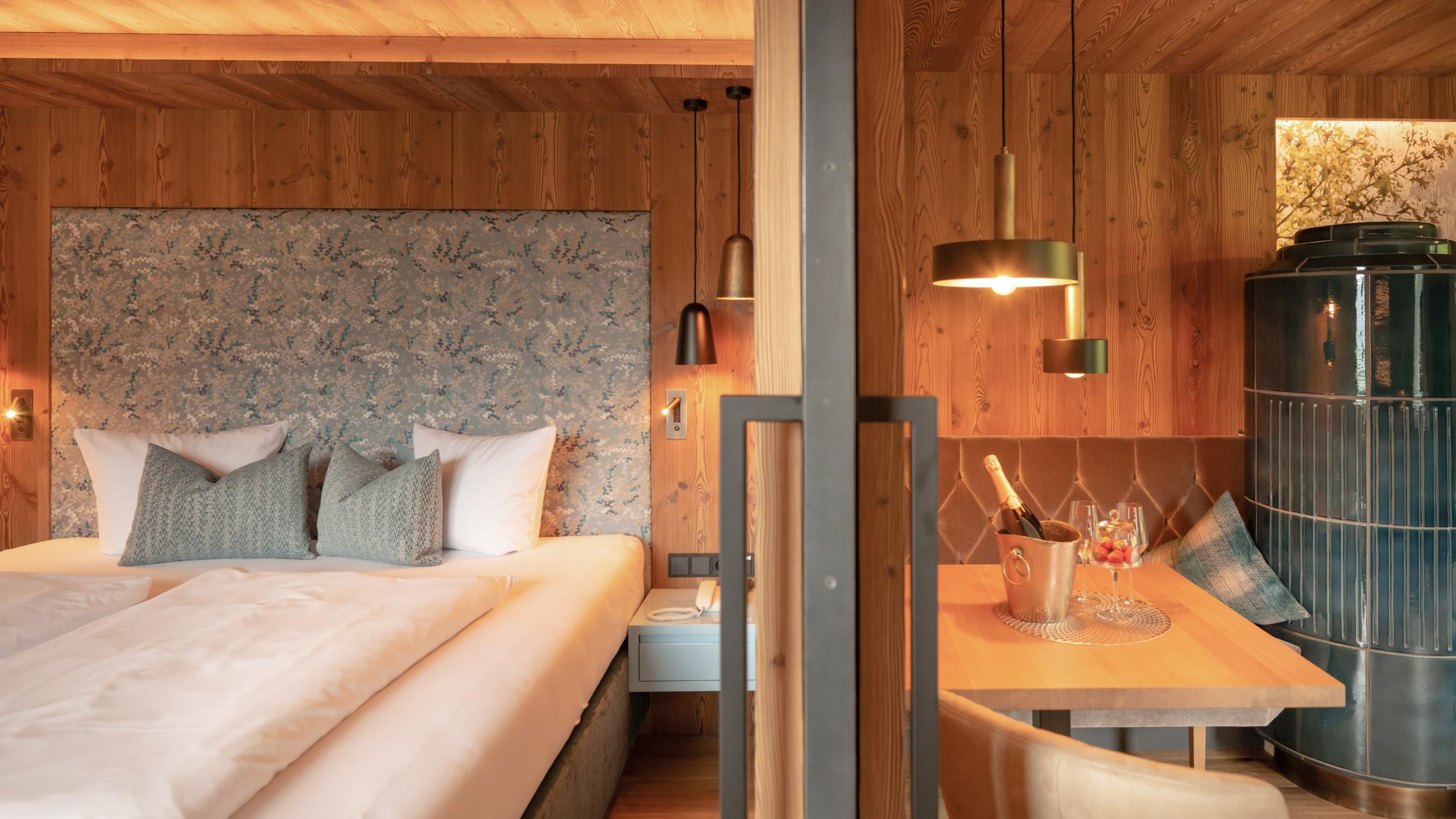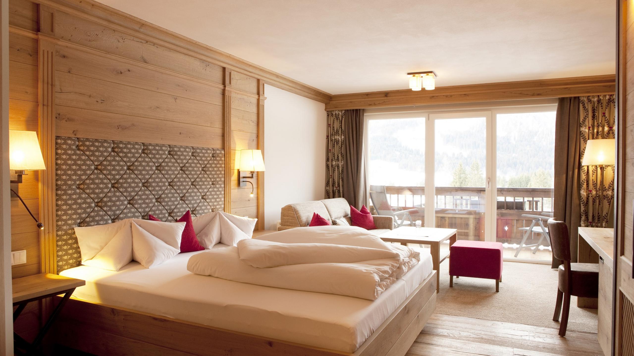 All our rooms are equipped according to standard with telephone, safe, hairdryer, satellite TV, free Wi-Fi, and a rented wellness basket with snuggly bathrobes, sauna towels, and slippers. An umbrella and a rucksack are also provided in each room. You are welcome to use them throughout your stay – at no charge, of course. Please note that the room pictures and floor plans may differ slightly from the original. The prices are per person and night including our gourmet board with breakfast buffet, afternoon snack, and 5-course menu in the evening. The visitor’s tax of € 2.50 per adult and day is not included. Dogs are allowed in some room categories at the Sonnenhof. The surcharge for a dog is € 30.00 per night without food. If necessary we charge at least €60.00 for a more elaborate final cleaning.