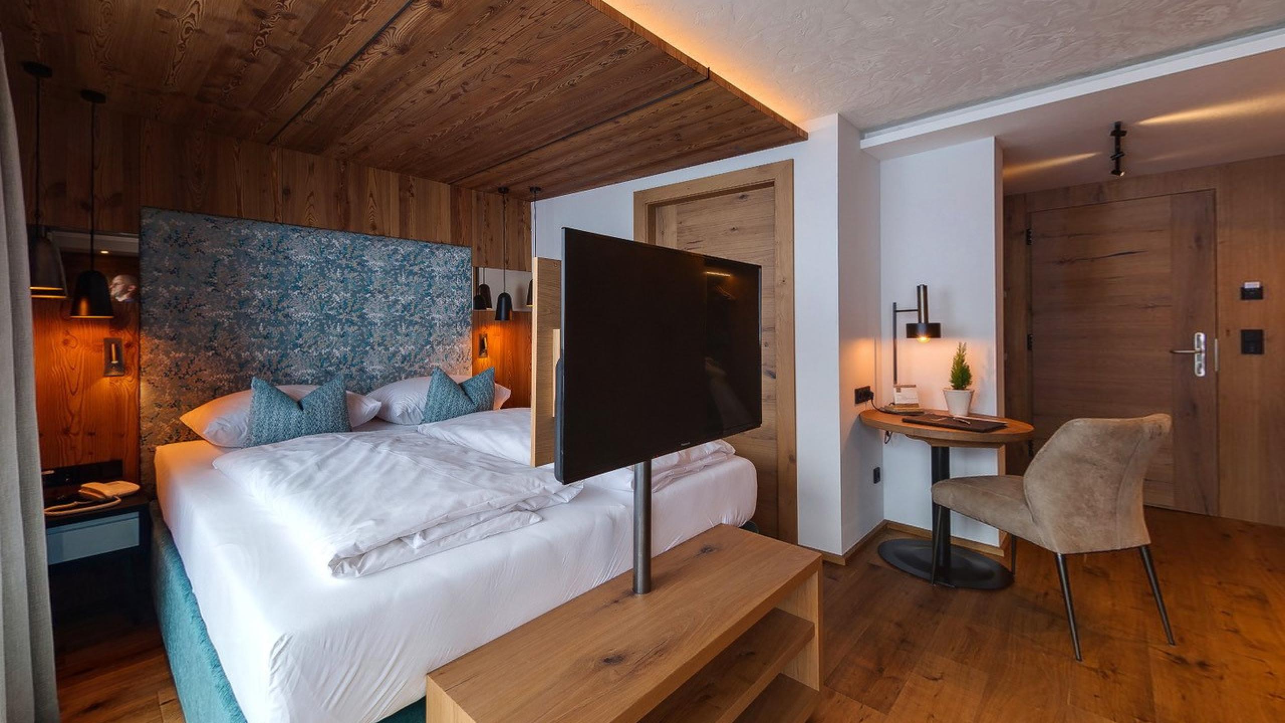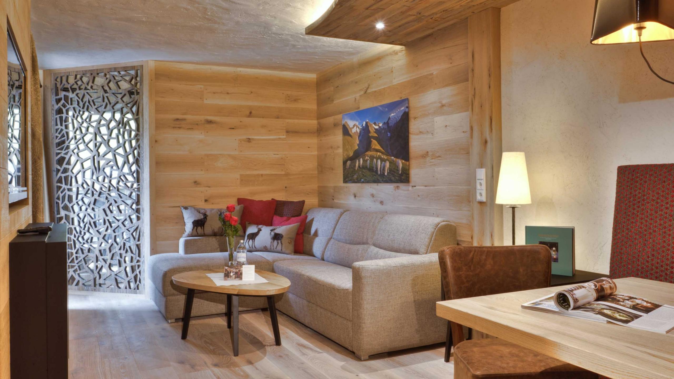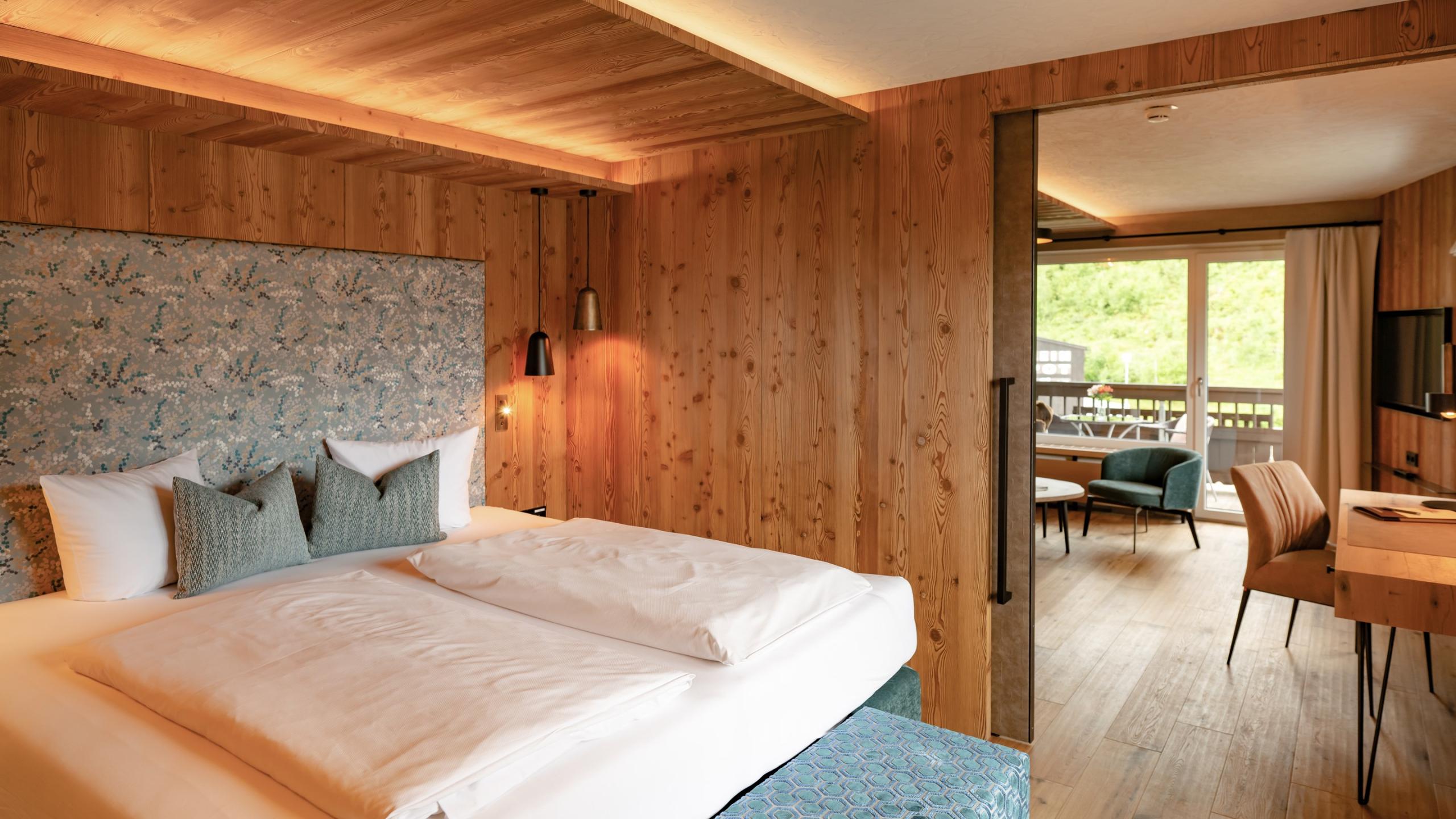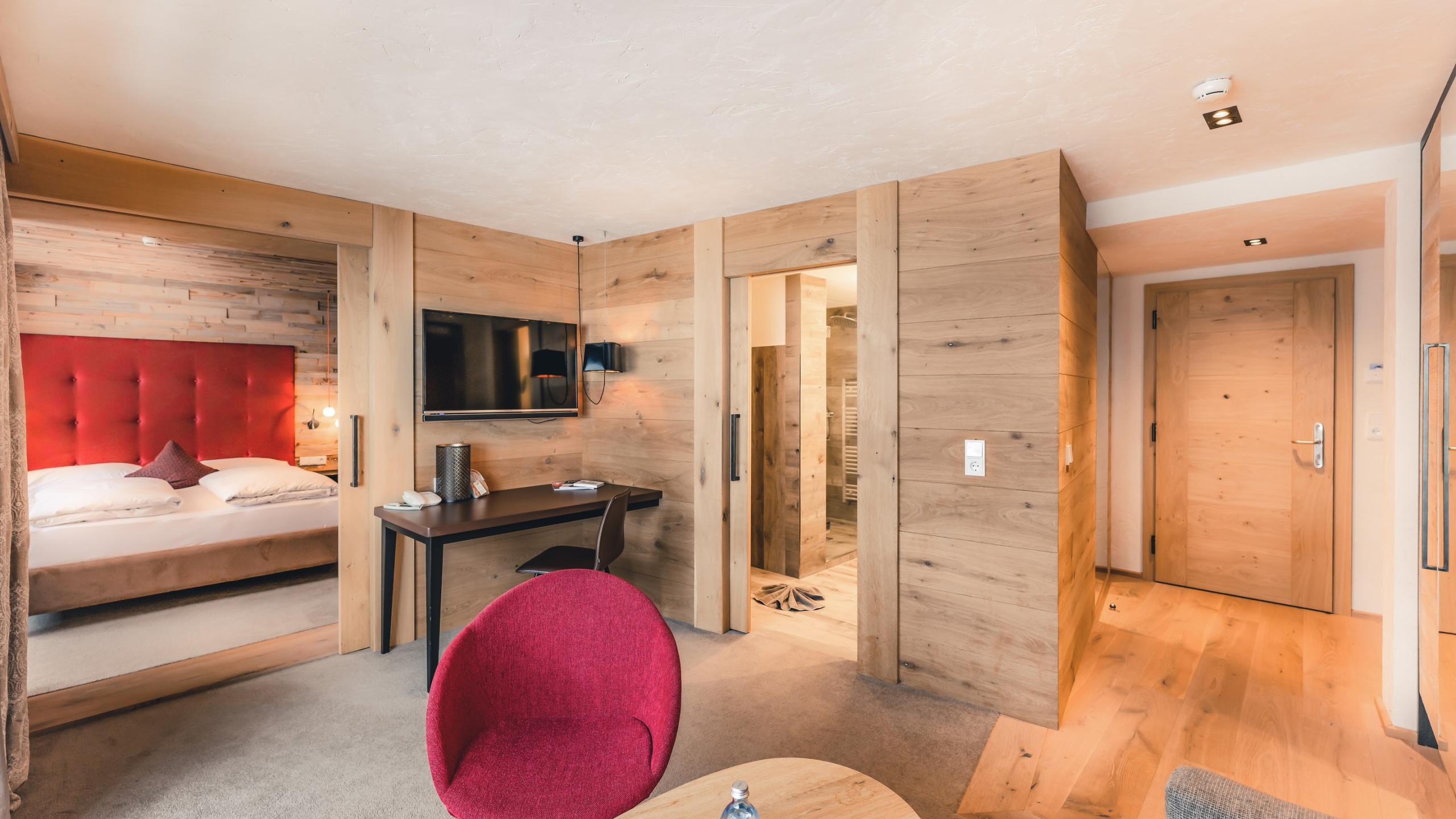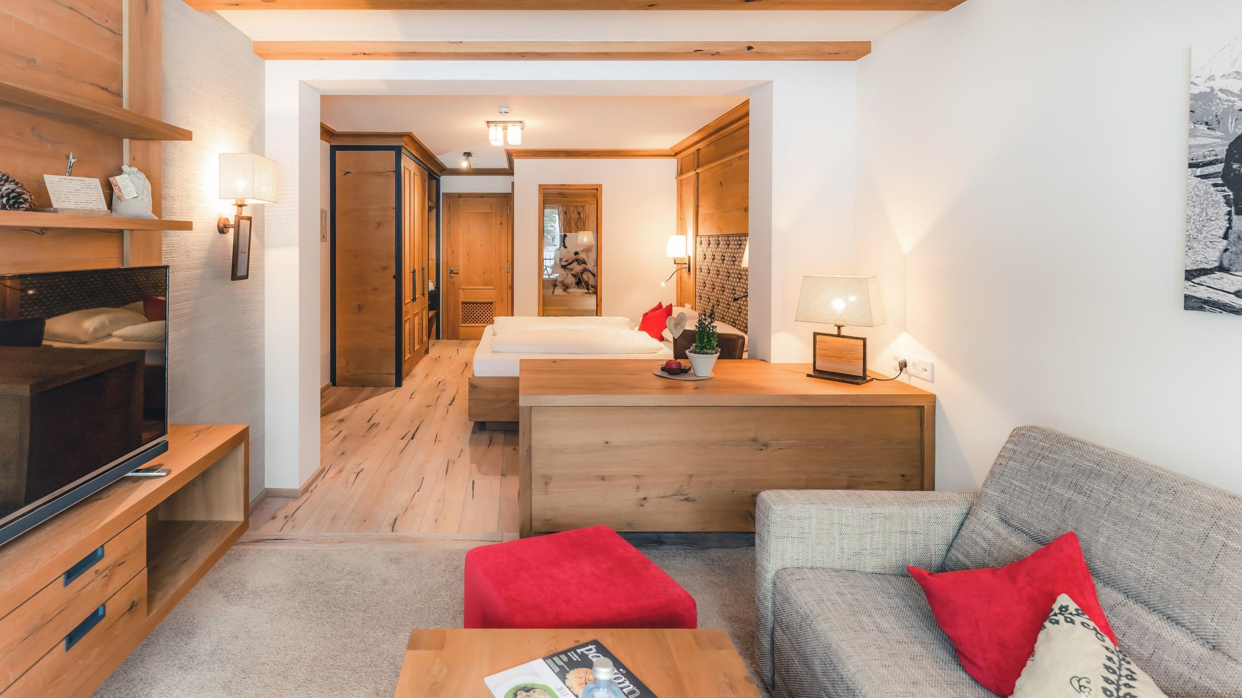 A panoramic view from your bed – if you can’t imagine anything more wonderful, than this suite is for you. The large sunny balcony with its south-east view tempts you to the ski lift or to the alpine meadows and the peaks of the Rote Flüh and Gimpel in summer. The suite consists of a bedroom with a double bed and many cupboards as well as a living room with a pull-out sofa bed and a desk. The rooms both have a television and can be easily separated by a sliding door.