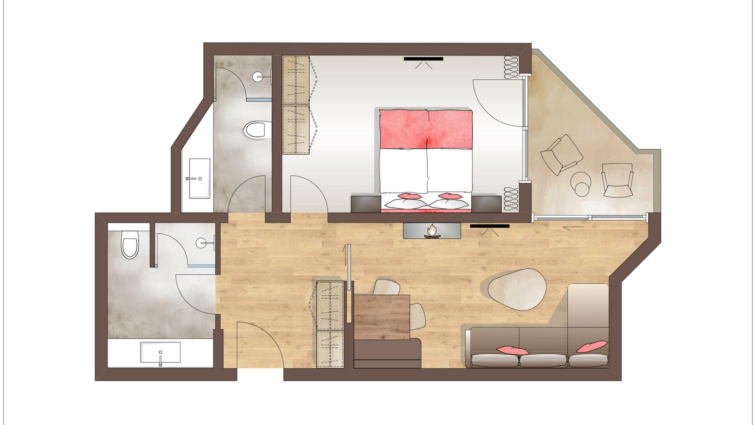 2 Zimmer, 2 Bäder, 2 Fernseher und 1 Kamin – der Wahnsinn! Diese großzügige Suite besteht aus einem Schlafzimmer mit Doppelbett und aus einer Loggia mit einer großen, ausziehbaren Eck-Couch, einem Schreibtisch, einem stylischen Effektfeuerkamin und einem Tisch für vier Personen. Im Wohn- und Schlafzimmer befindet sich jeweils ein Fernseher. Die beiden Bäder mit ebenerdigen Duschen sorgen für noch mehr Privatsphäre. Vom schönen Südbalkon haben Sie einen herrlichen Blick auf das Neunerköpfle.